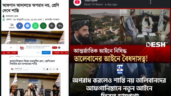 আফগানিস্তানের নতুন ফৌজদারি আইন নিয়ে গণমাধ্যমে প্রচার হয়েছে মিথ্যা তথ্য আফগানিস্তানের নতুন ফৌজদারি আইন নিয়ে কিছু গণমাধ্যম বিভ্রান্তিকর ও ভুল তথ্য প্রচার করছে—এমন অভিযোগ উঠেছে। read more