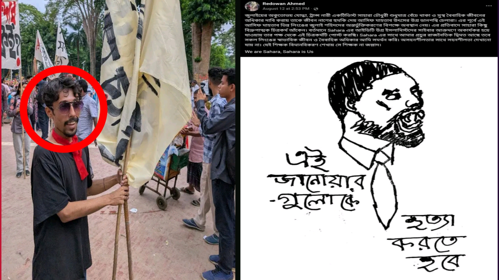 কিন্তু এখানেই ঘটনা থেমে থাকেনি। গত ১২ আগস্ট ইস্ট ওয়েস্ট বিশ্ববিদ্যালয়ের অর্থনীতি বিভাগের ছাত্র রেদোয়ান আহমেদও একই ধরনের হত্যার হুমকি দেন, আসিফ মাহতাব উৎসের ক্যারিকেচার অঙ্কন করেন এবং সাফওয়ানের কর্মকাণ্ডের প্রতি প্রকাশ্যে সমর্থন জানান। তার প্রোফাইল থেকে জানা যায়, তিনি অতীতে ছাত্র ইউনিয়নের রাজনীতির সাথে জড়িত ছিলেন এবং বর্তমানে “বিপ্লবী ছাত্র যুব আন্দোলন” (Revolutionary Student-Youth Movement) নামক একটি সংগঠনের সক্রিয় সদস্য, যা মাওবাদী সন্ত্রাসী মতবাদ ধারণ করে বলে অভিযোগ রয়েছে।