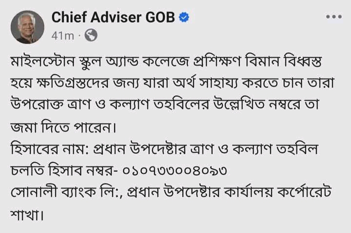 সম্প্রতি রাজধানীর মাইলস্টোন স্কুল অ্যান্ড কলেজে ঘটে যাওয়া ভয়াবহ বিমান বিধ্বস্ত ঘটনায় শতাধিক ছাত্র নিহত ও আহত হলেও, সেই পরিবারগুলোকে সরাসরি সহায়তা না দিয়ে বরং প্রধান উপদেষ্টার দপ্তর থেকে সামাজিক মাধ্যমে একাউন্ট নম্বর দিয়ে অর্থ সাহায্যের আবেদন জানানো হয়েছে!