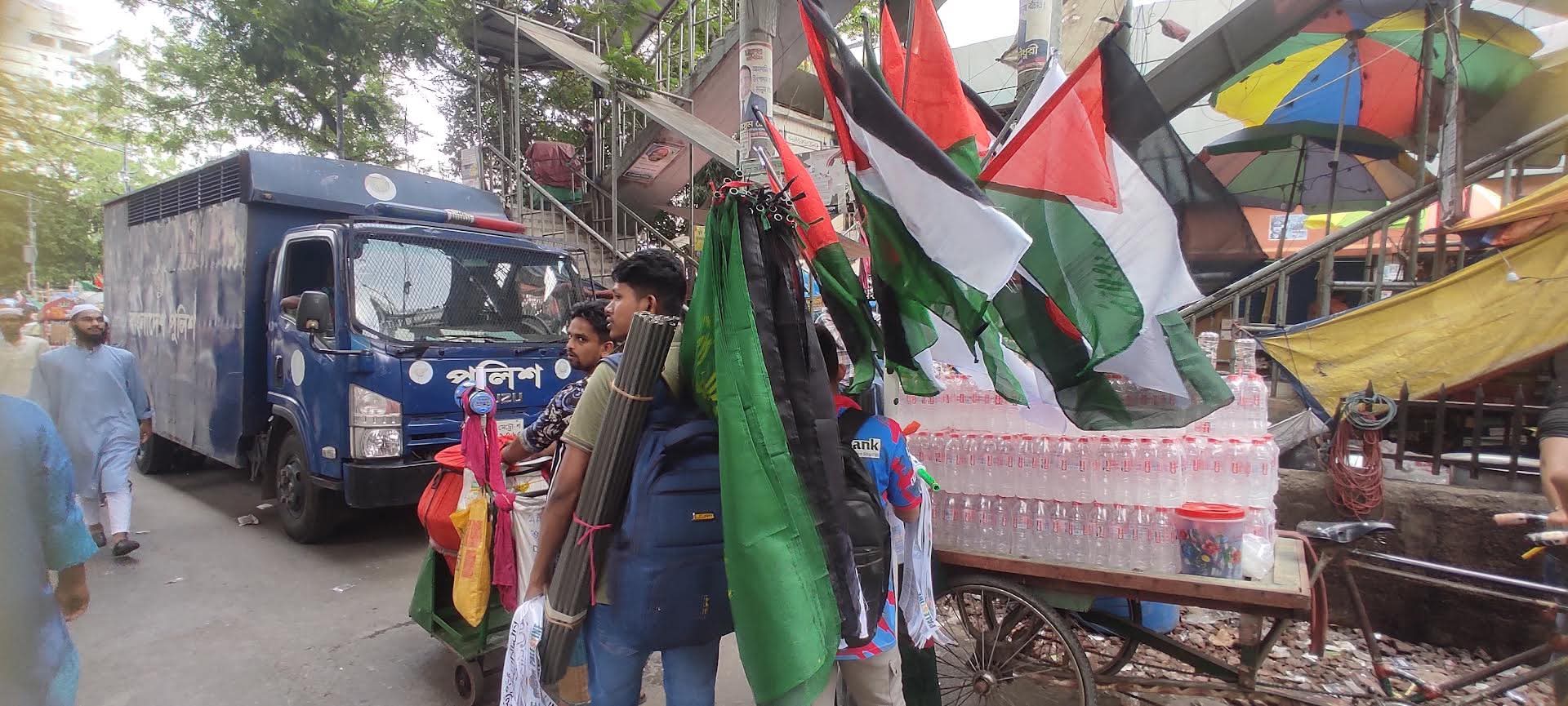 বায়তুল মোকাররমে বিক্ষোভ ঘিরে ফিলিস্তিনের পতাকার চাহিদা বাড়লেও, ক্ষোভ বাড়ছে দাম নিয়ে